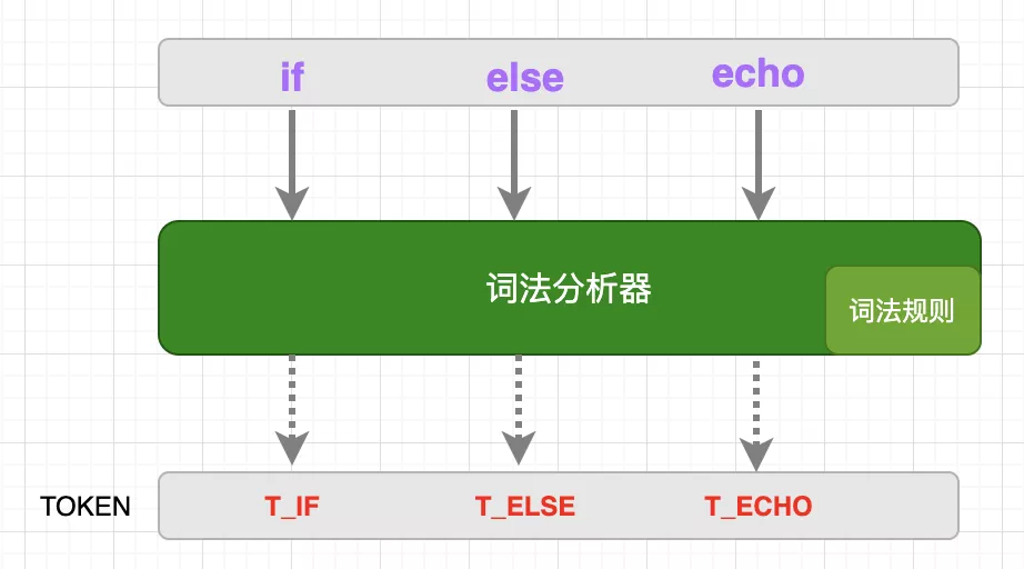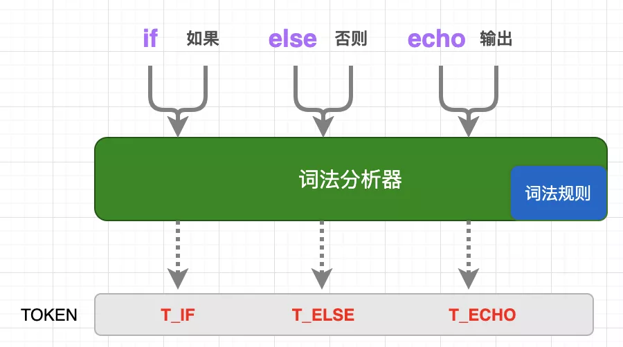 词法分析器遇到一个词汇,就去查询一本词典(词法规则)。如果查到了该词汇的话,则会得到一个合规的token,接下来把token传递给语法分析器进行后续处理。