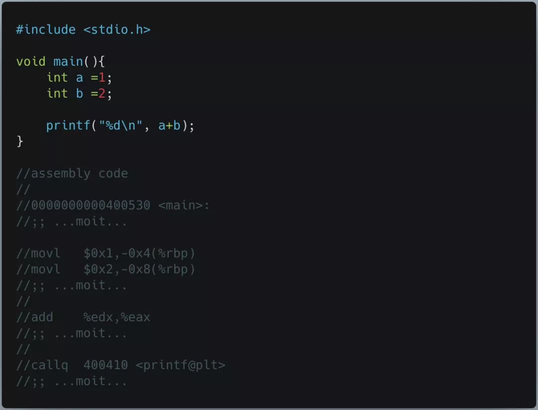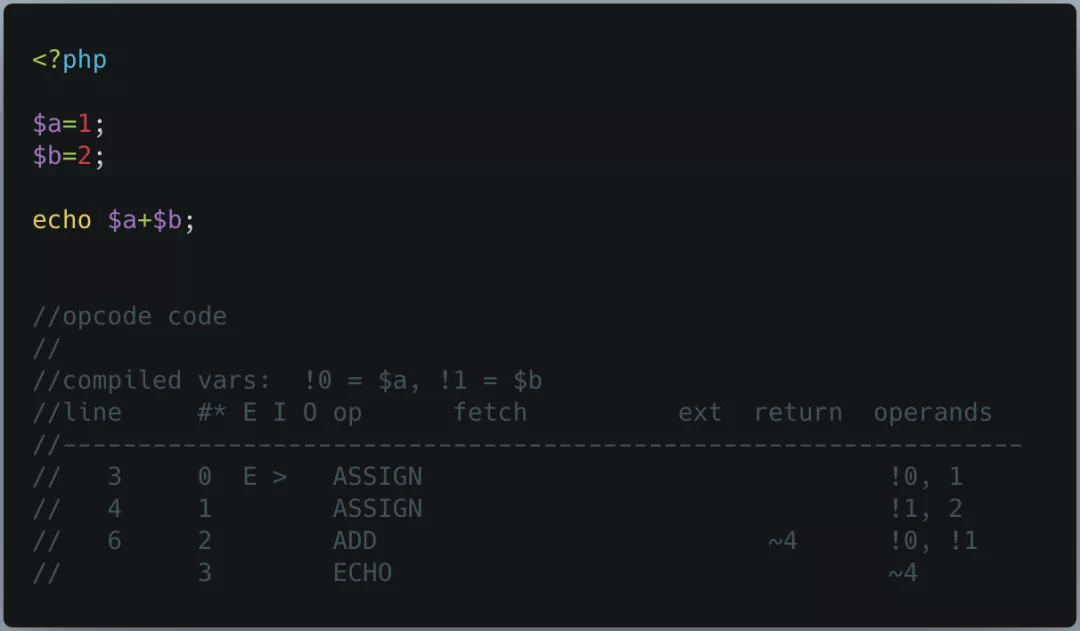 下面分别使用解释型语言PHP、编译型语言C来实现相同的加法功能,并查看其中间码(下图显示的是简化之后的中间码),进行对比分析。