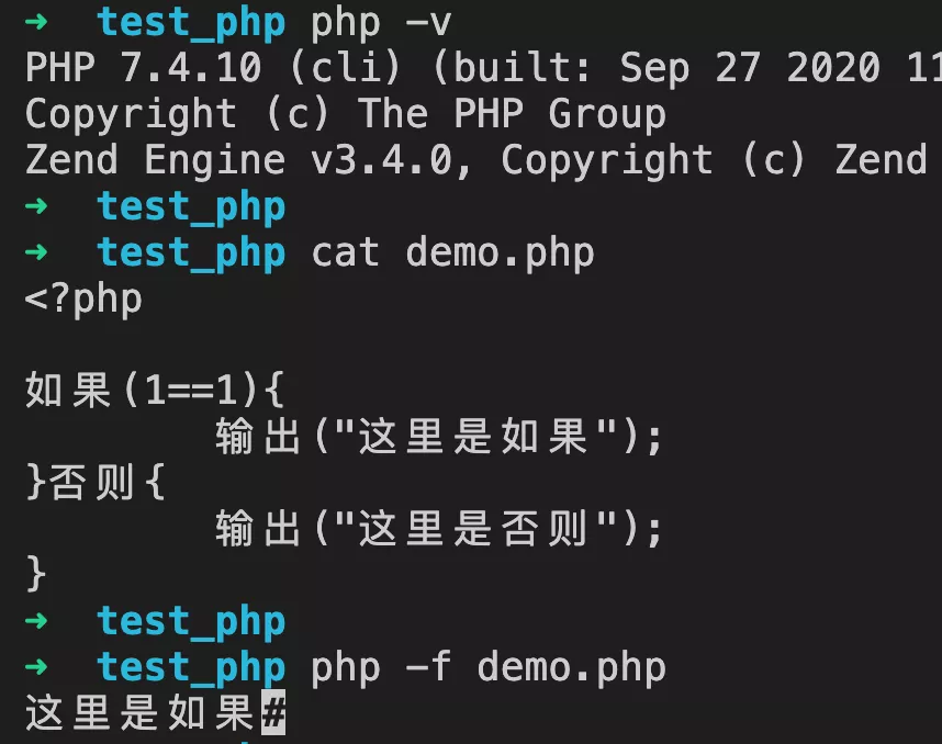 到这里,恭喜你不仅已经拥有了一个跟笔者一样的,可以执行中文编写的1.2示例代码的PHP程序。而且,还可以基于PHP,来自定义一个属于自己的中文编程规范。