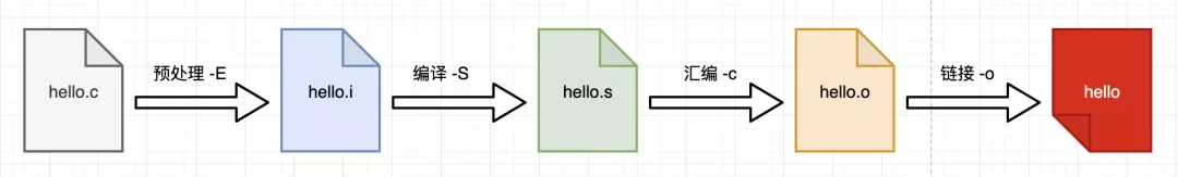 源代码(source code)→ 预处理器(preprocessor)→ 编译器(compiler)→ 汇编程序(assembler)→ 目标代码(object code)→ 链接器(linker)→ 可执行文件(executables),最后打包好的文件就可以给计算机去运行了。