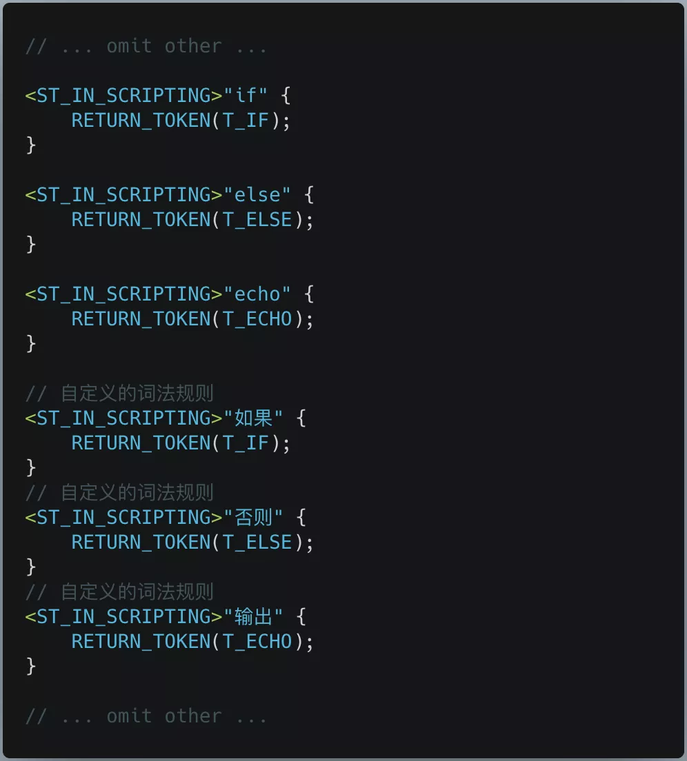 在这里,笔者只是在词法分析器的词典中多添加了几个条目,把新增的几个条目映射到原有的合法token上去,也正是这几个条目使得1.2处代码可以正确的执行(虽然是中文编写的,但是词法分析器可以正确的识别其含义)。