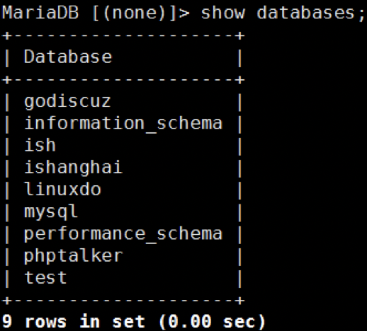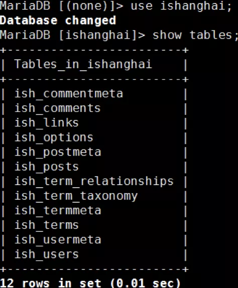 通过命令行查询MySQL下面所有存在的数据库以及ishanghai数据库的表。
