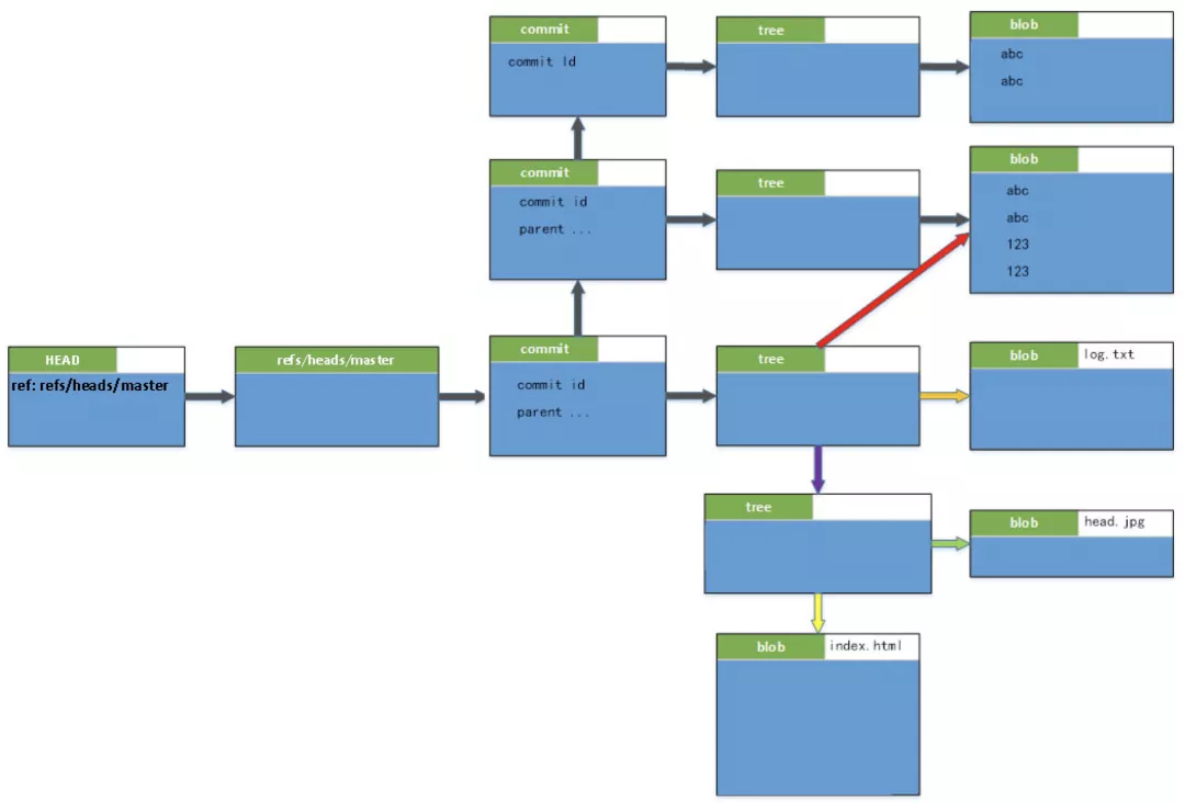 我们通过HEAD找到一个当前分支,然后通过当前分支的引用找到最新的commit。