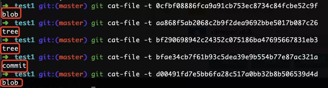 使用git cat-file -t “sha256 string”,分别查看每个文件的类型 当前提交共生成5个新的文件。