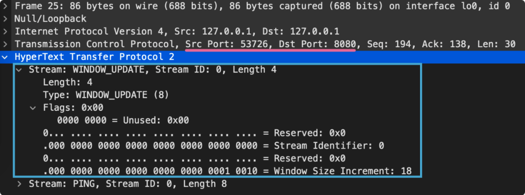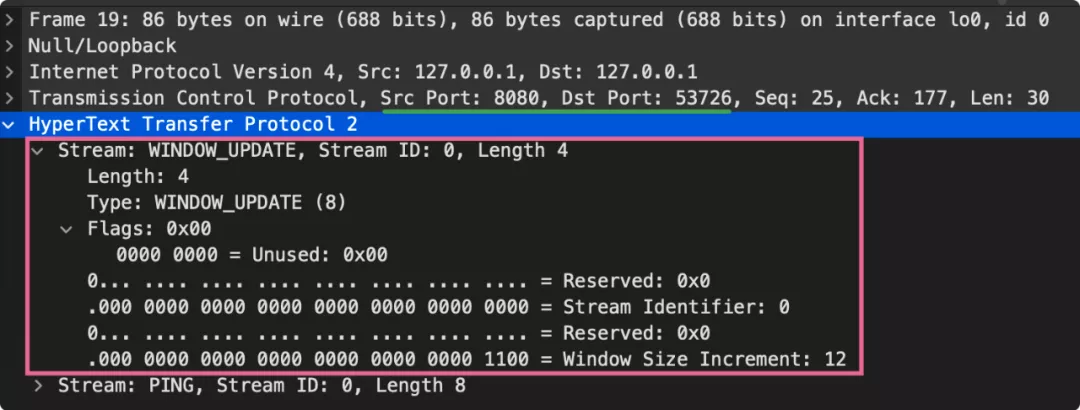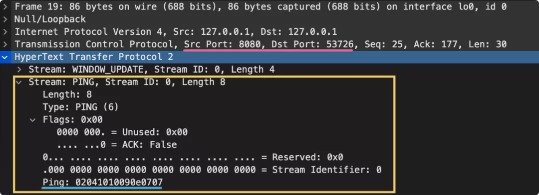 在抓包的过程中,发现在应用层出现若干不同Stream类型,分别有:Magic、SETTINGS、HEADERS、DATA、WINDOW_UPDATE、PING。