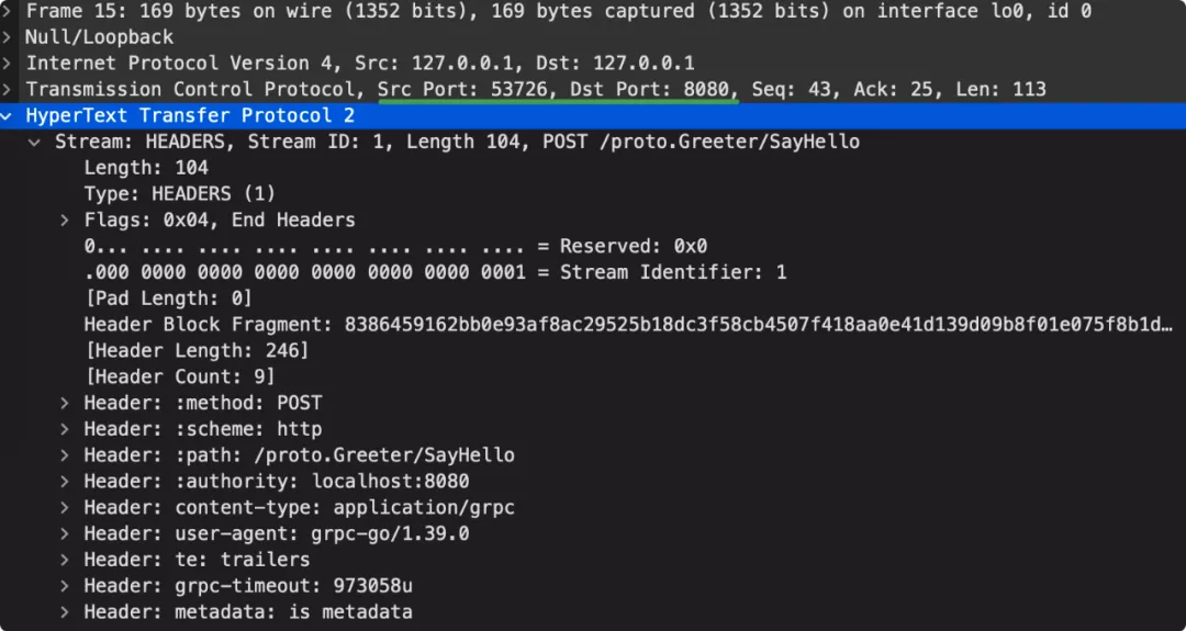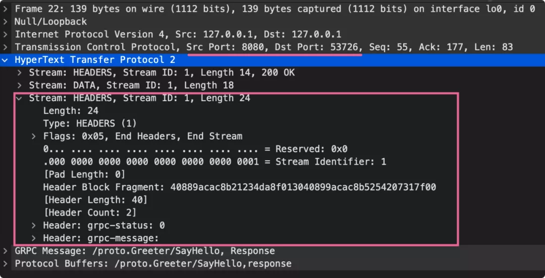 - 在gRpc中附加信息是基于HEADERS帧进行传递的,具体的请求、响应数据存储在DATA帧中