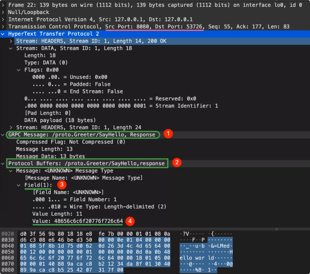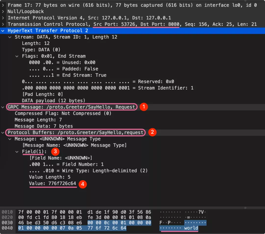 与protobuf有关,其中Field(1)为定义pb.HelloRequest结构的Name参数 &pb.HelloRequest{Name: "world"}。