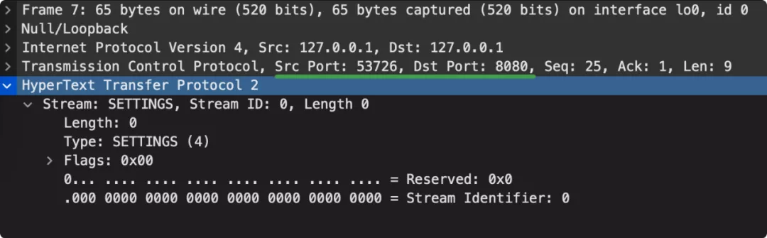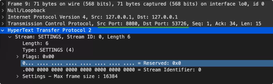 SETTINGS帧的主要作用:设置针对整个连接的参数。从图中可以看到出现了多个SETTINGS,原因是在发送完连接前言后,客户端、服务端还需要进一步的确定一些信息。