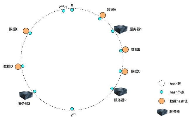 从图中可以看到,有三台服务器分别落在哈希环的不同节点位置。数据A、B、C、D、E也落在环的不同位置。根据一致性哈希要求,数据在计算得到自己的环中节点之后,顺时针找到第一个服务器节点,那台服务器就是数据的存储位置。