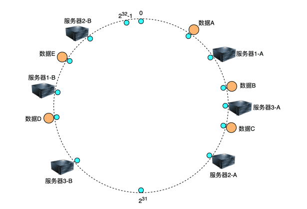 原来的一台服务器,在哈希环上只能拥有一个节点。那么,此时我们对每一台服务器进行虚拟。例如:原来的服务器1,现在虚拟为2台,服务器1-A、服务器1-B,此时这2台虚拟服务器会在哈希环上拥有不同的2个节点(但是它们实际映射到同一台真实的服务器上)。此时,哈希环就发生了变化。