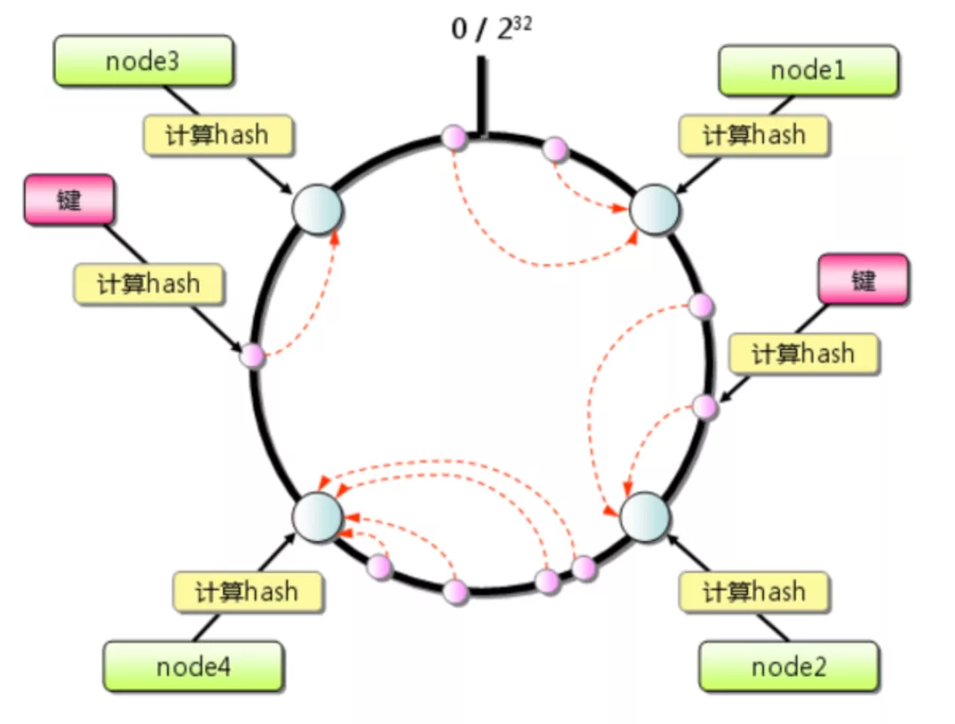 - 数据存储时,对指定的key进行hash计算,然后用hash值对232取模,确定数据落在环的哪一个节点上,得到环的节点值之后,顺时针方向找到遇到的第一台服务器,这台服务器就是存储当前数据的地方。
