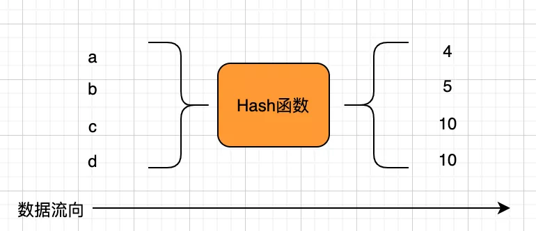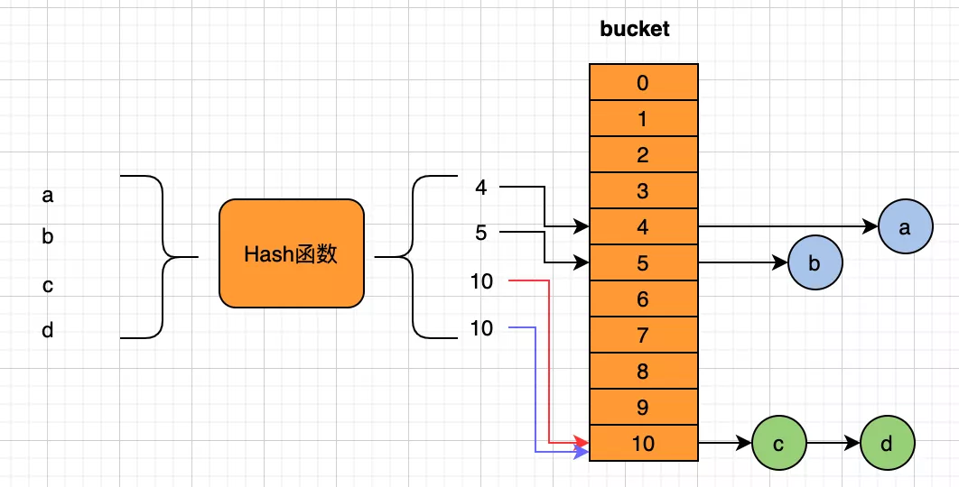 例如下图所示:c、d在经过某个哈希函数计算之后得到相同的哈希值10,那么c、d 就发生了哈希碰撞。