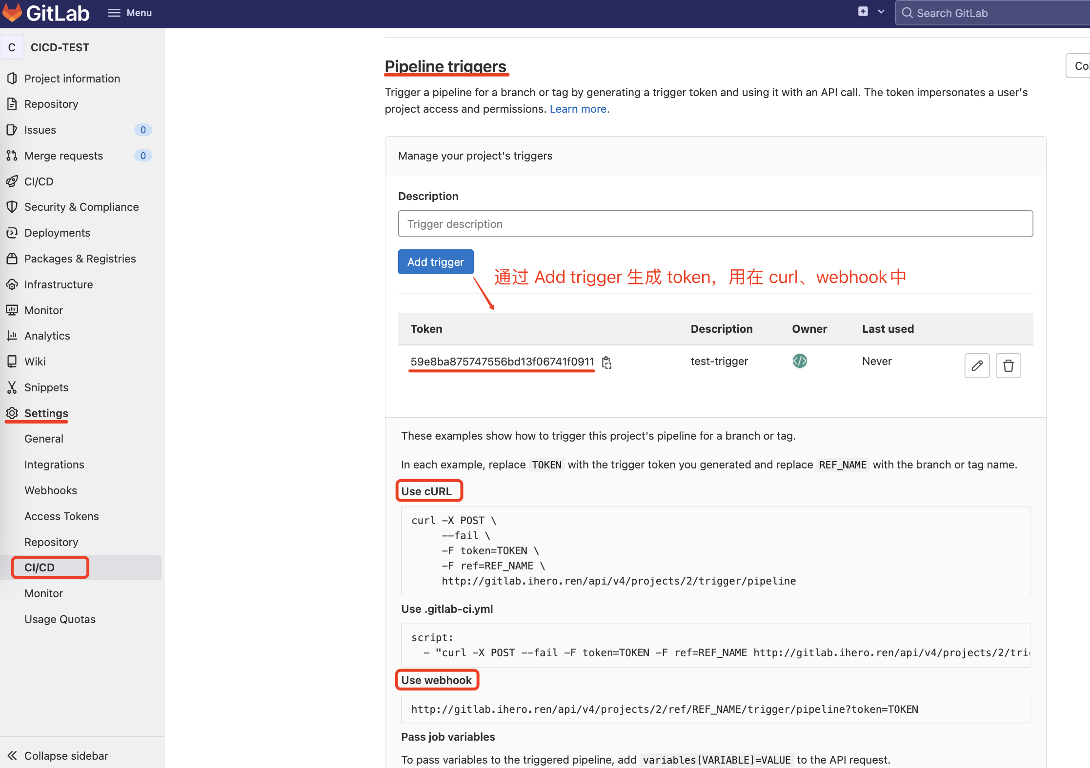 3、4的触发方式可以在 Setting -> CI/CD -> Pipeline triggers 看到
