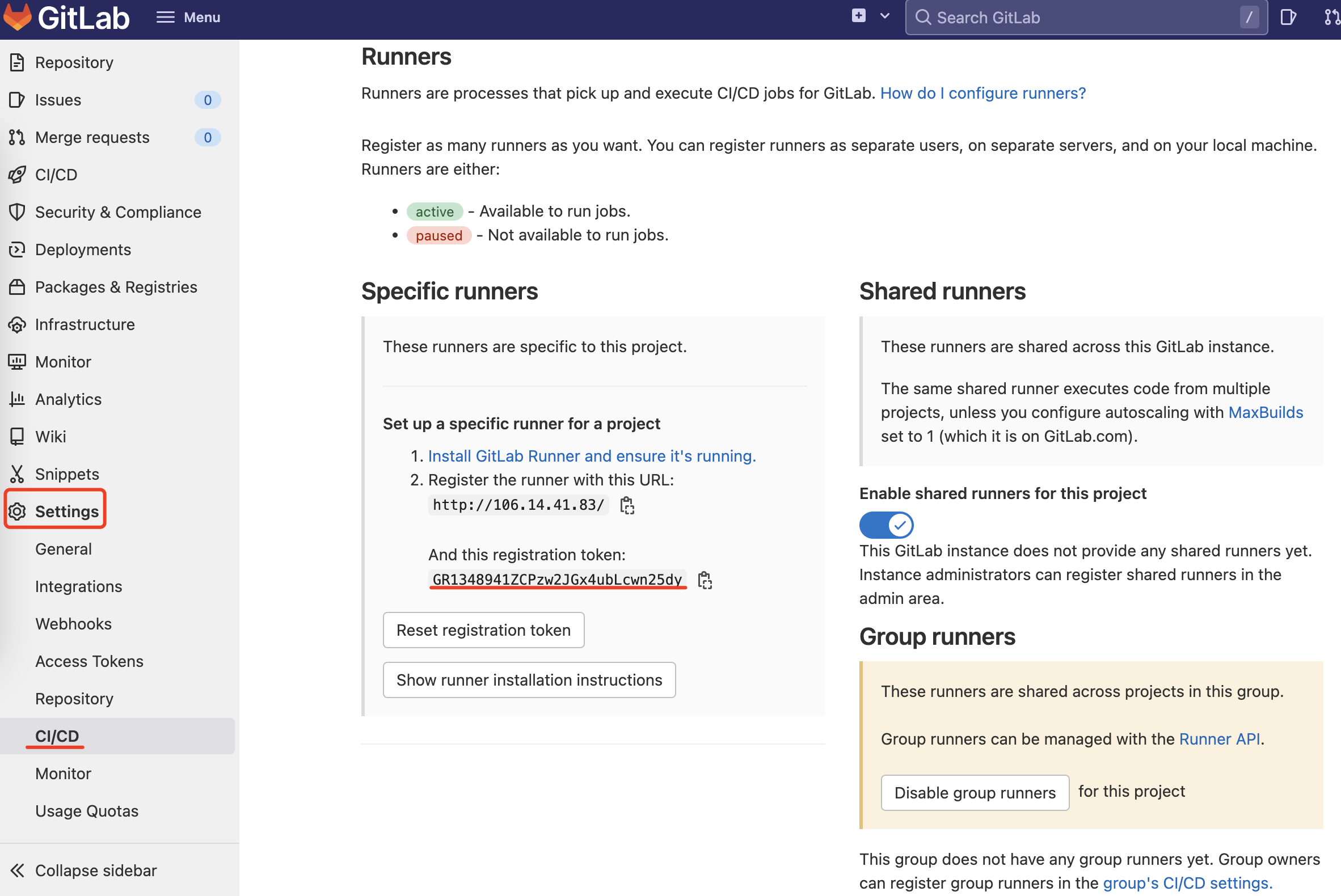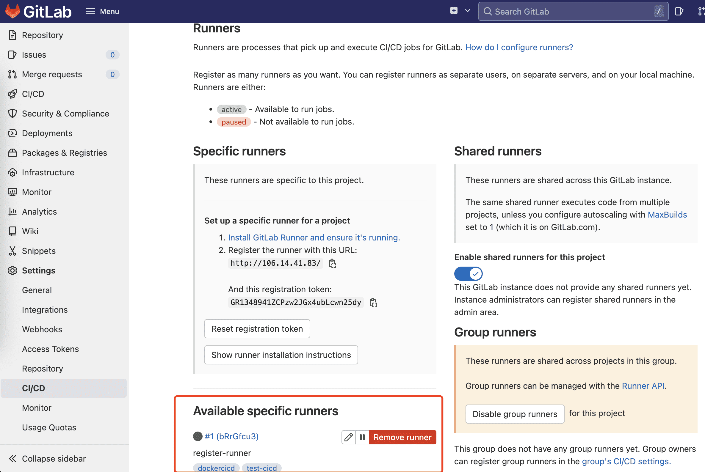 在 gitlab 中查看 runner 注册是否成功,如下所示多了一个可用的 runner,它的 tag-list 为 test-cicd, dockercicd