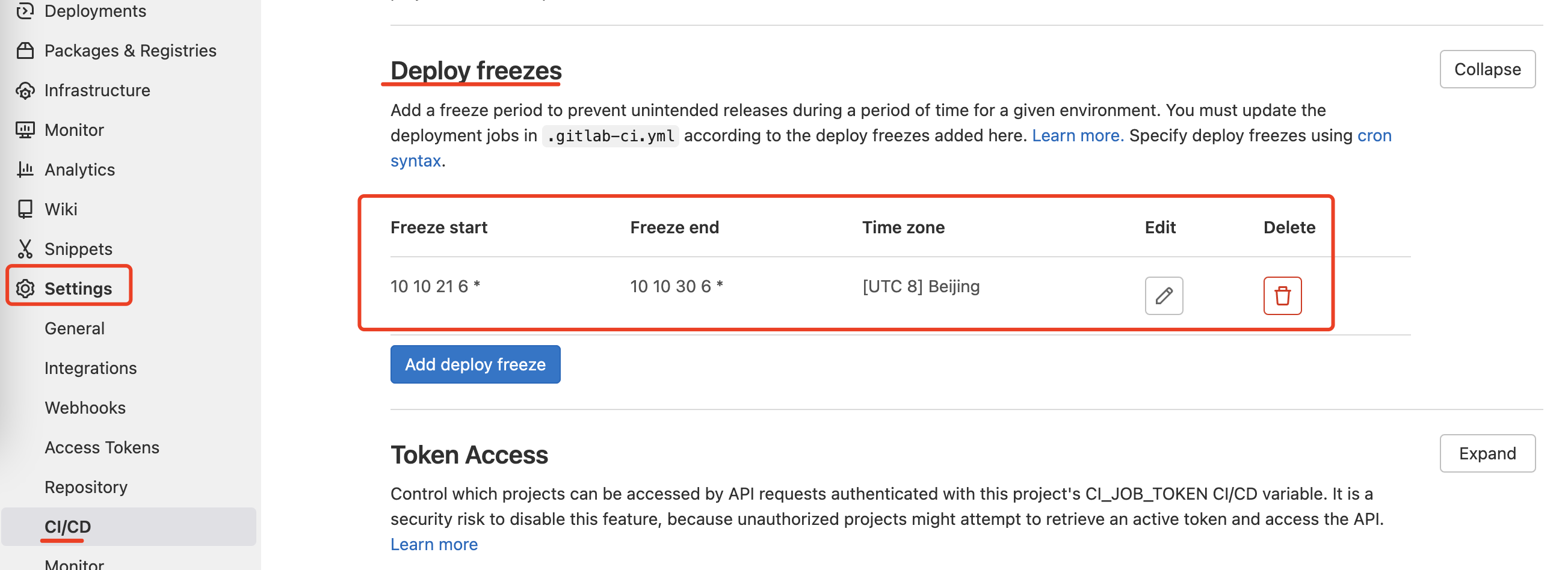 举个例子:节假日公司进入发布封锁期,此时不能随意发布代码,在gitlab中通过 Deploy freezes 来实现指定时间段内禁止执行 job。
